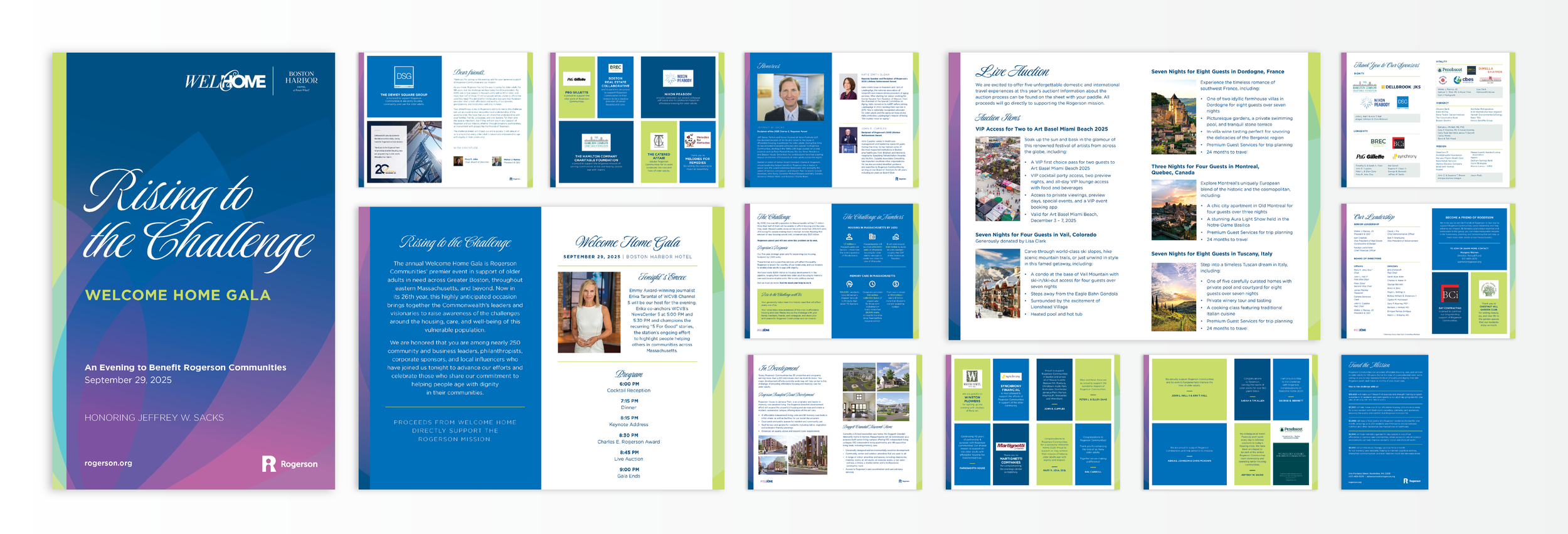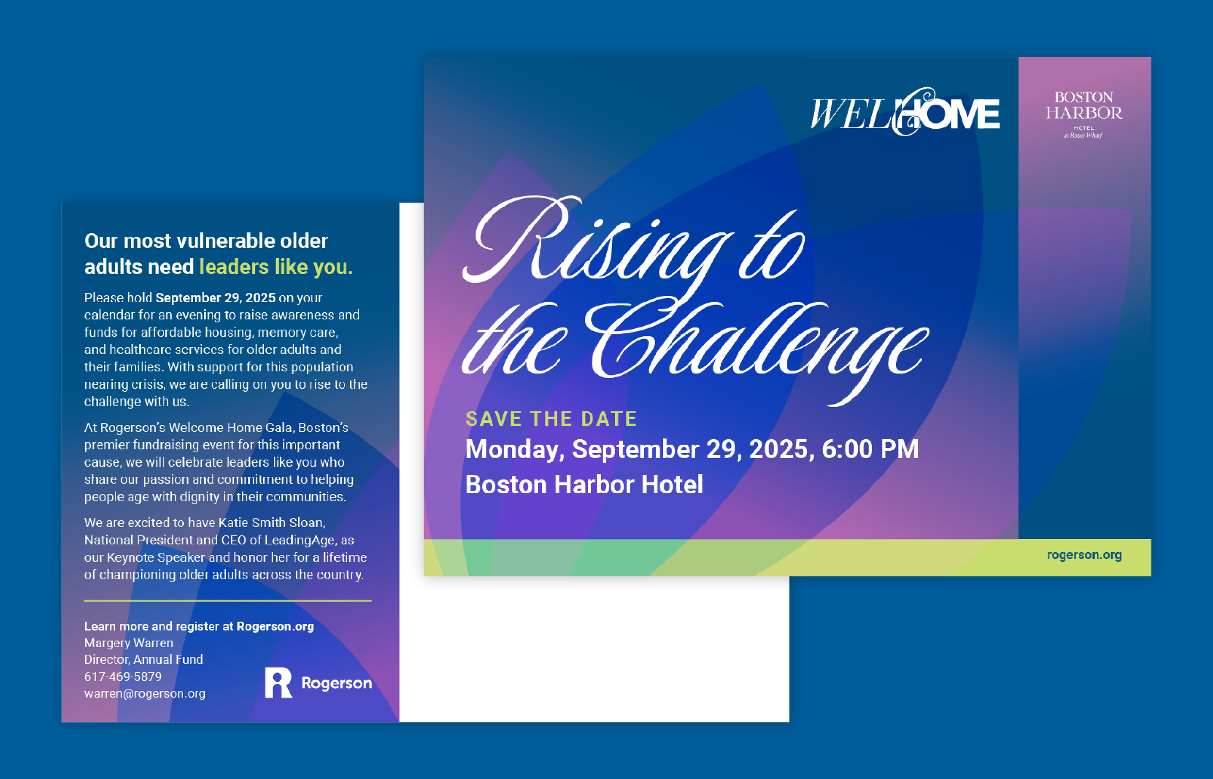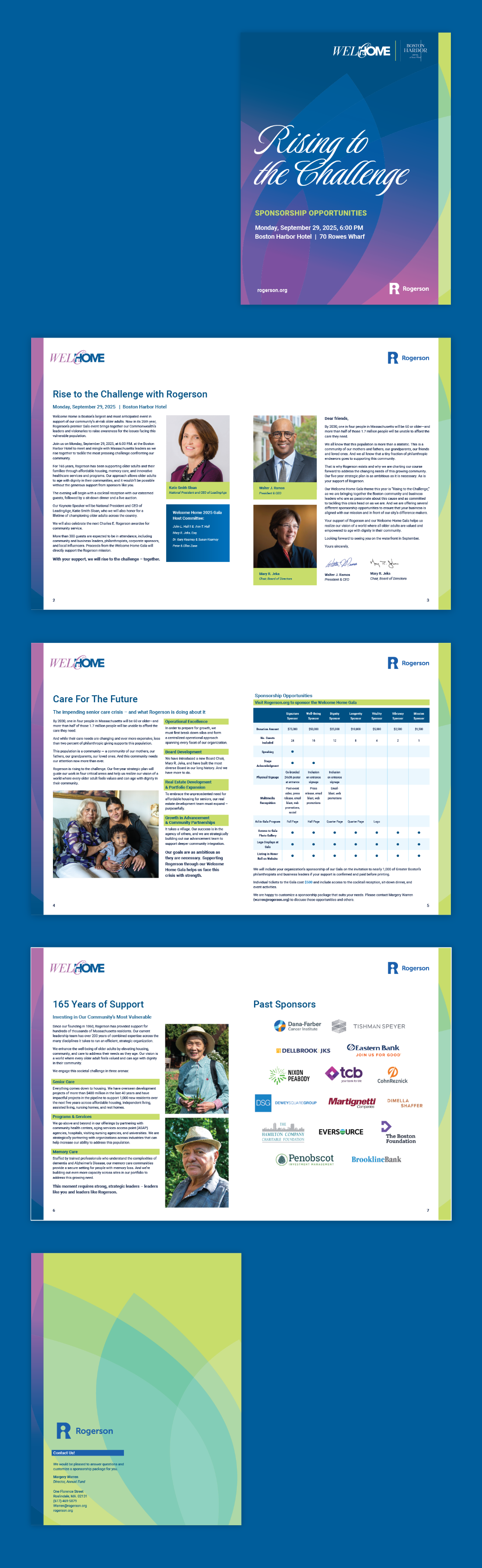 Rogerson Communities provides essential housing and supportive services for older adults and families, and the Welcome Home gala serves as their premier fundraising event, celebrating both their mission and the community they serve. This year, I had the opportunity to design the visual identity and full suite of materials for the event, balancing warmth and sophistication, across invitations, brochures, programs, signage, and digital assets.