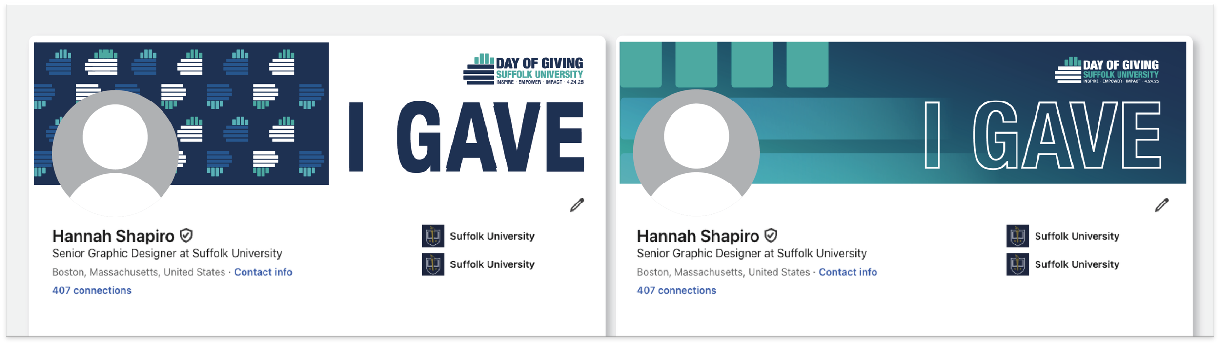 For Suffolk University’s 2025 Day of Giving spring campaign, I developed a vibrant visual identity—rooted in the overarching Suffolk brand—to bring fresh energy to the initiative. Deliverables included a new logo, branded patterns, social media graphics and toolkit, and a suite of swag items, all designed to generate excitement and engagement.
