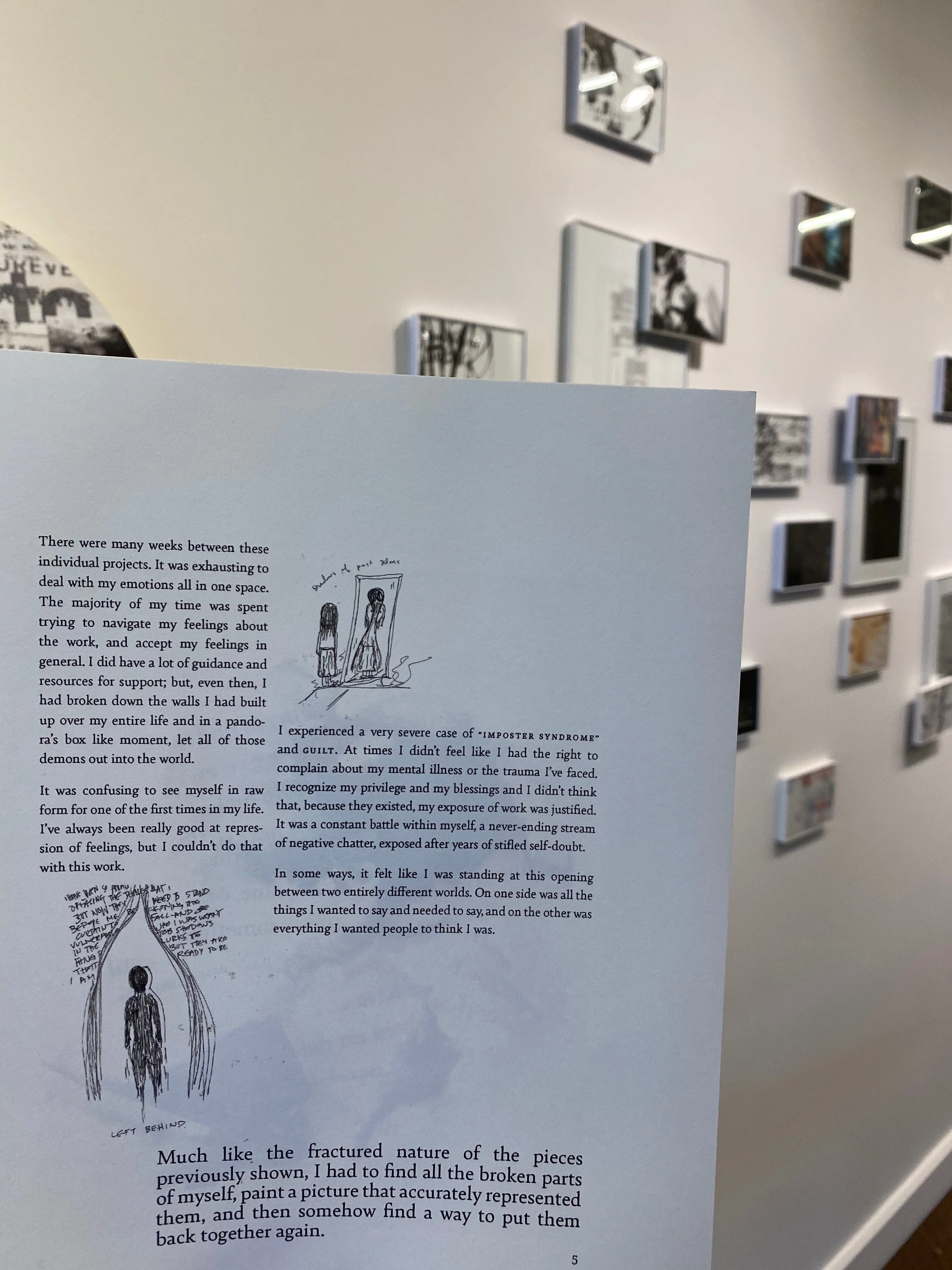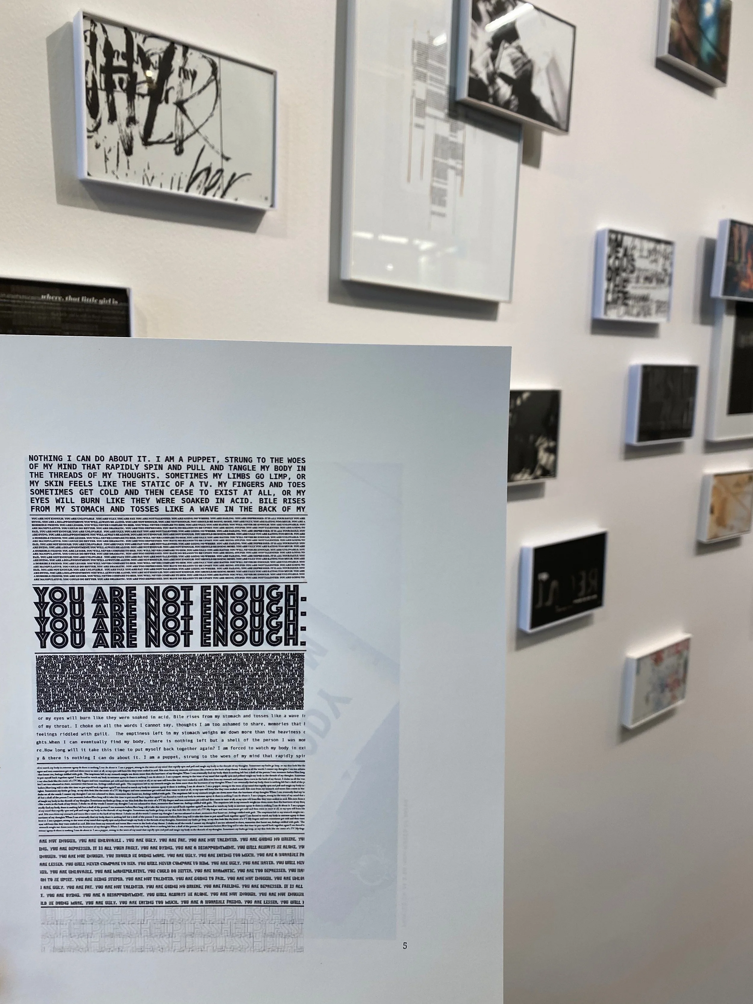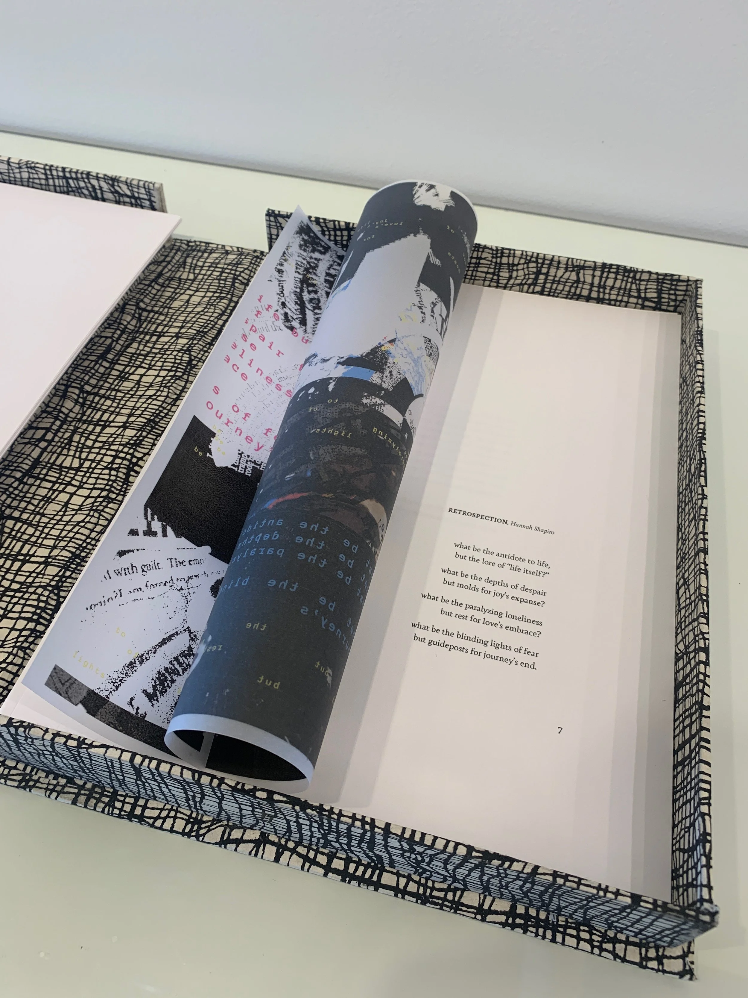 These seven experiences were documented through diverse editorial compositions and printed on materials relative to the content: the thicker the cardstock, the heavier the content; transparencies where it unraveled; printer paper for the “regular” human emotion; and so on.