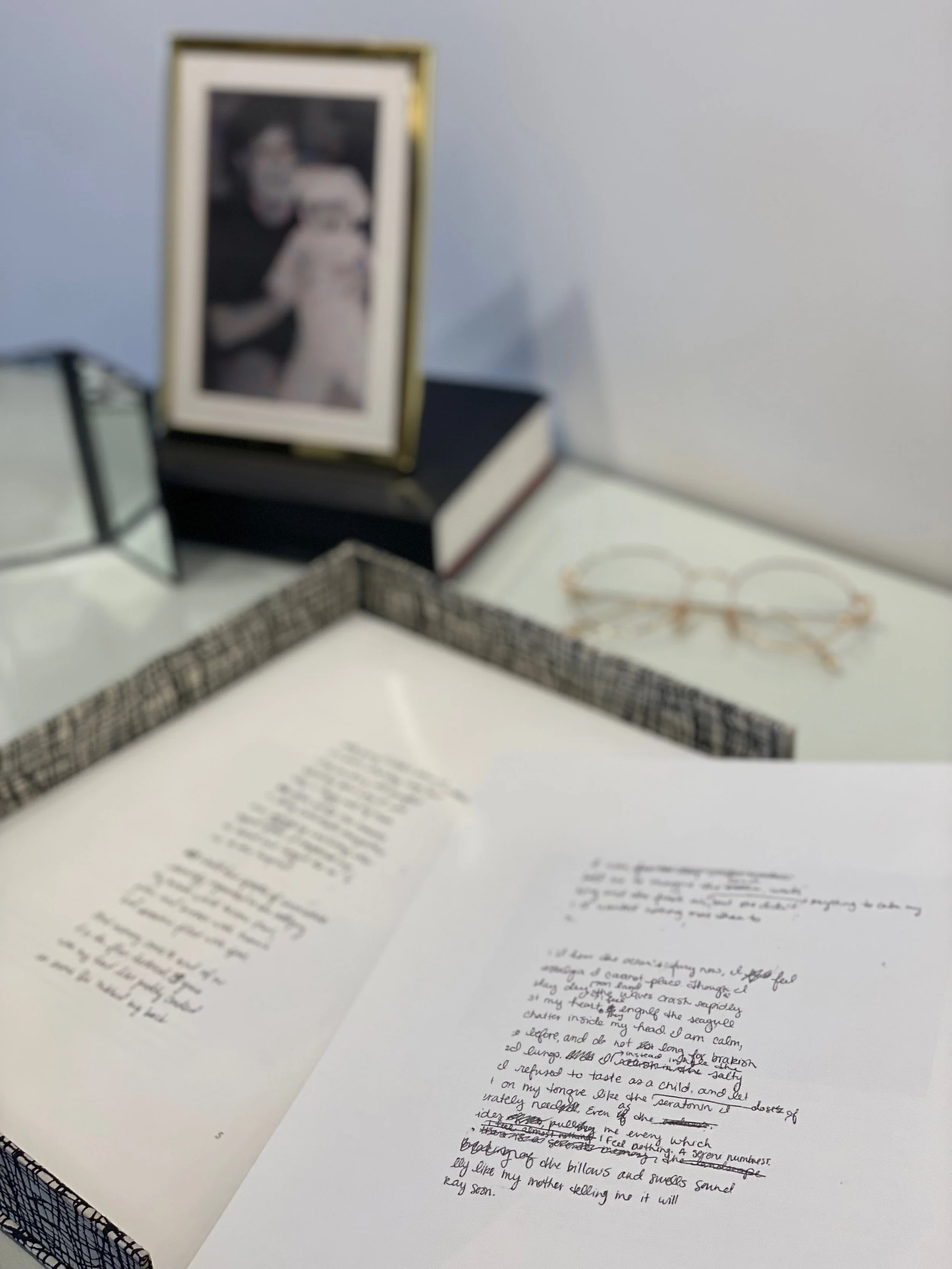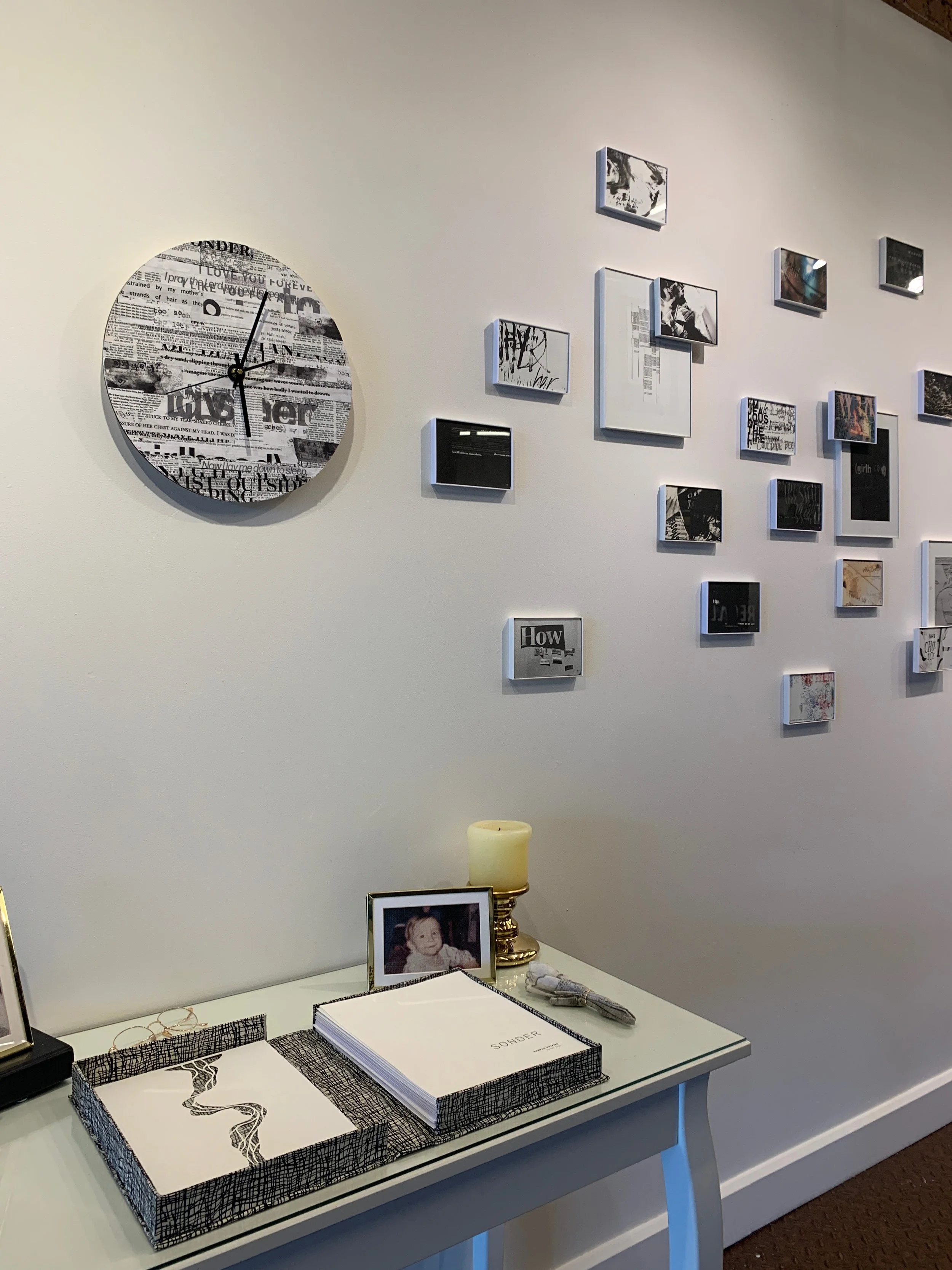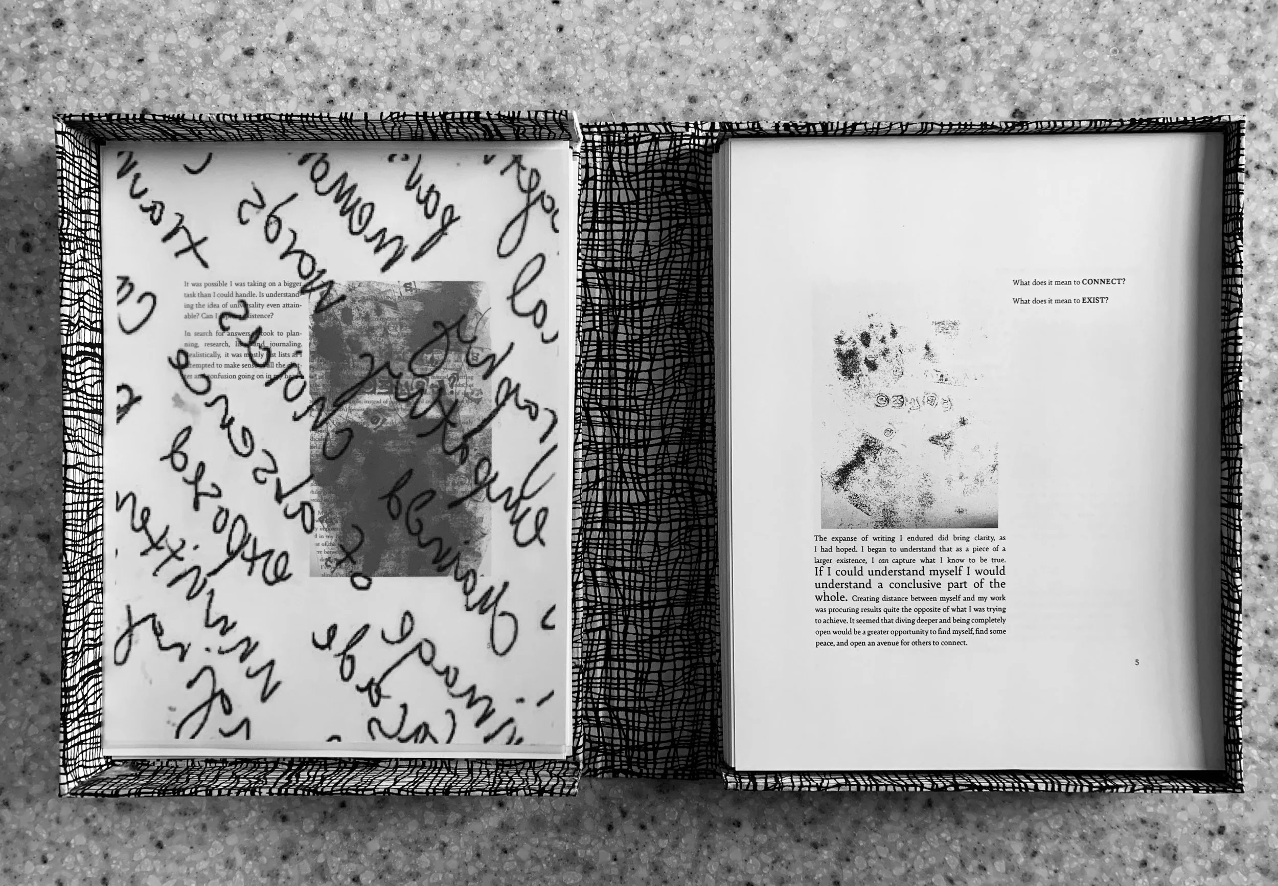 These seven experiences were documented through diverse editorial compositions and printed on materials relative to the content: the thicker the cardstock, the heavier the content; transparencies where it unraveled; printer paper for the “regular” human emotion; and so on.