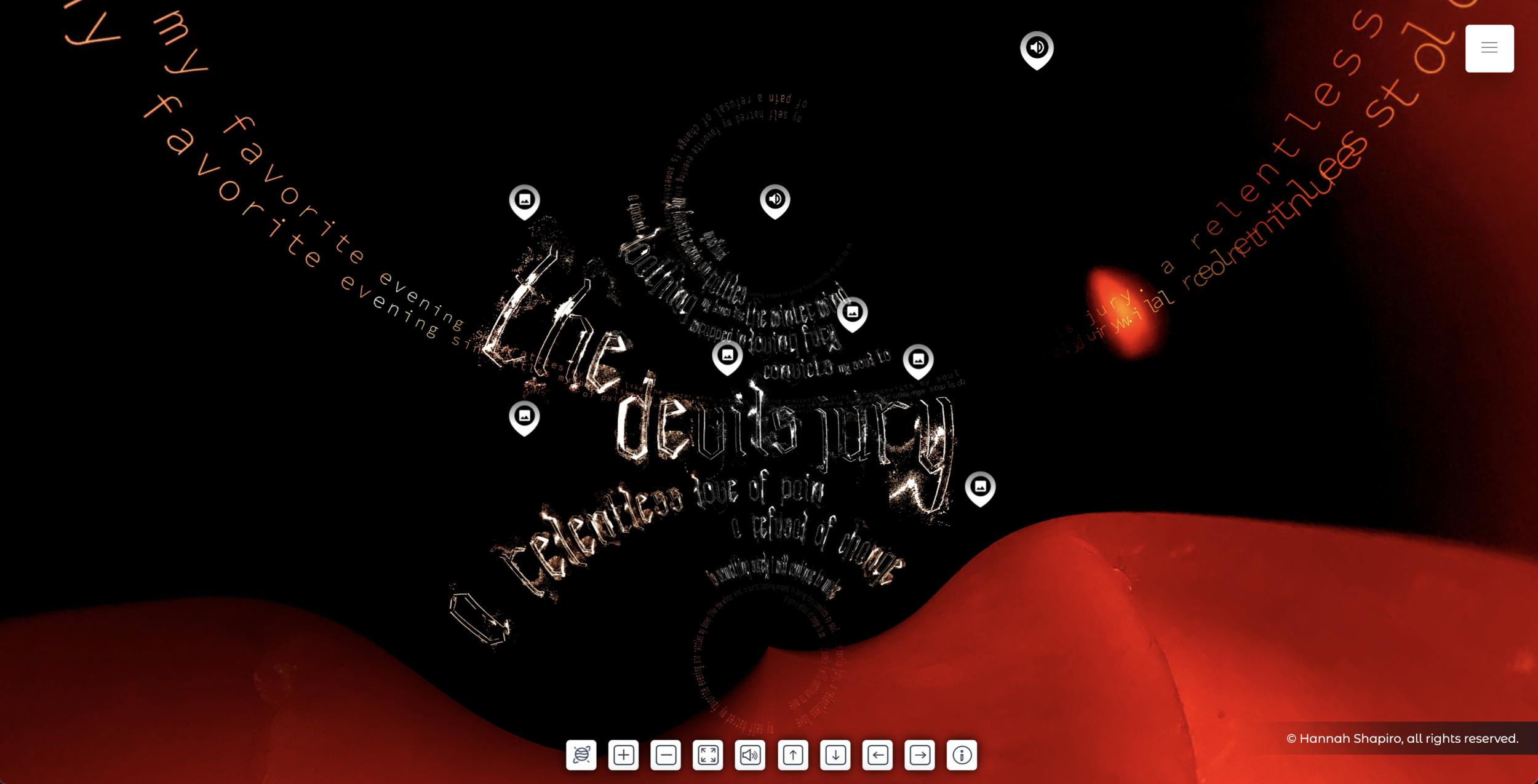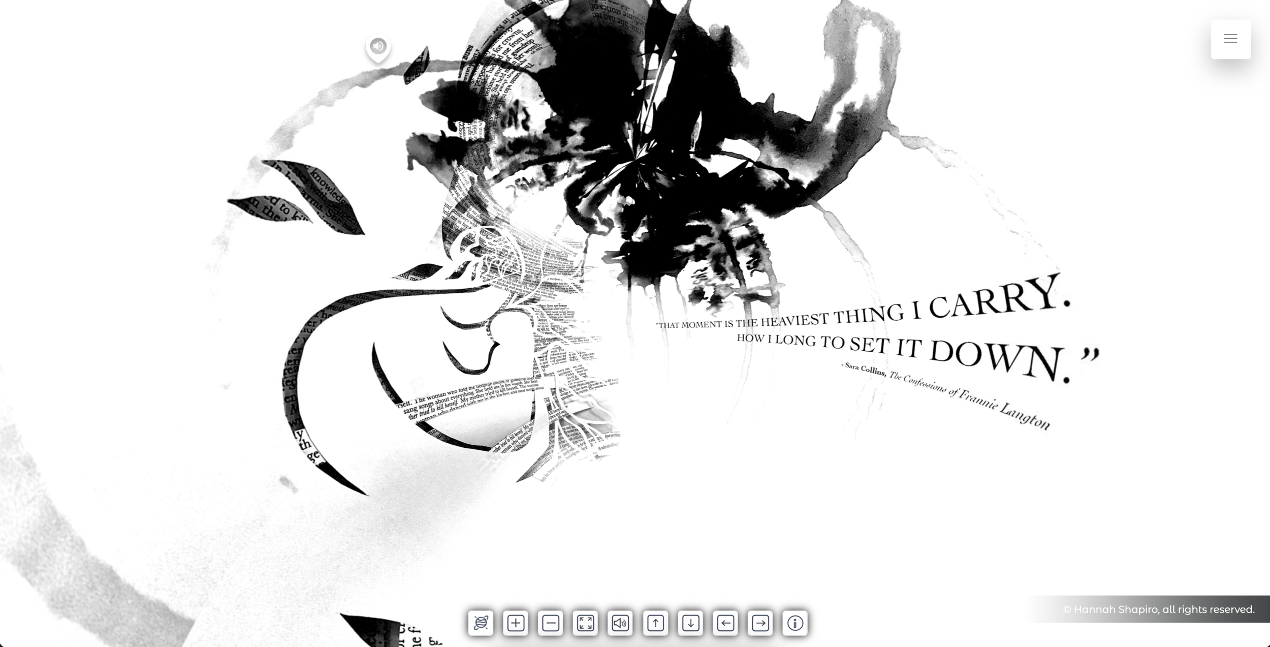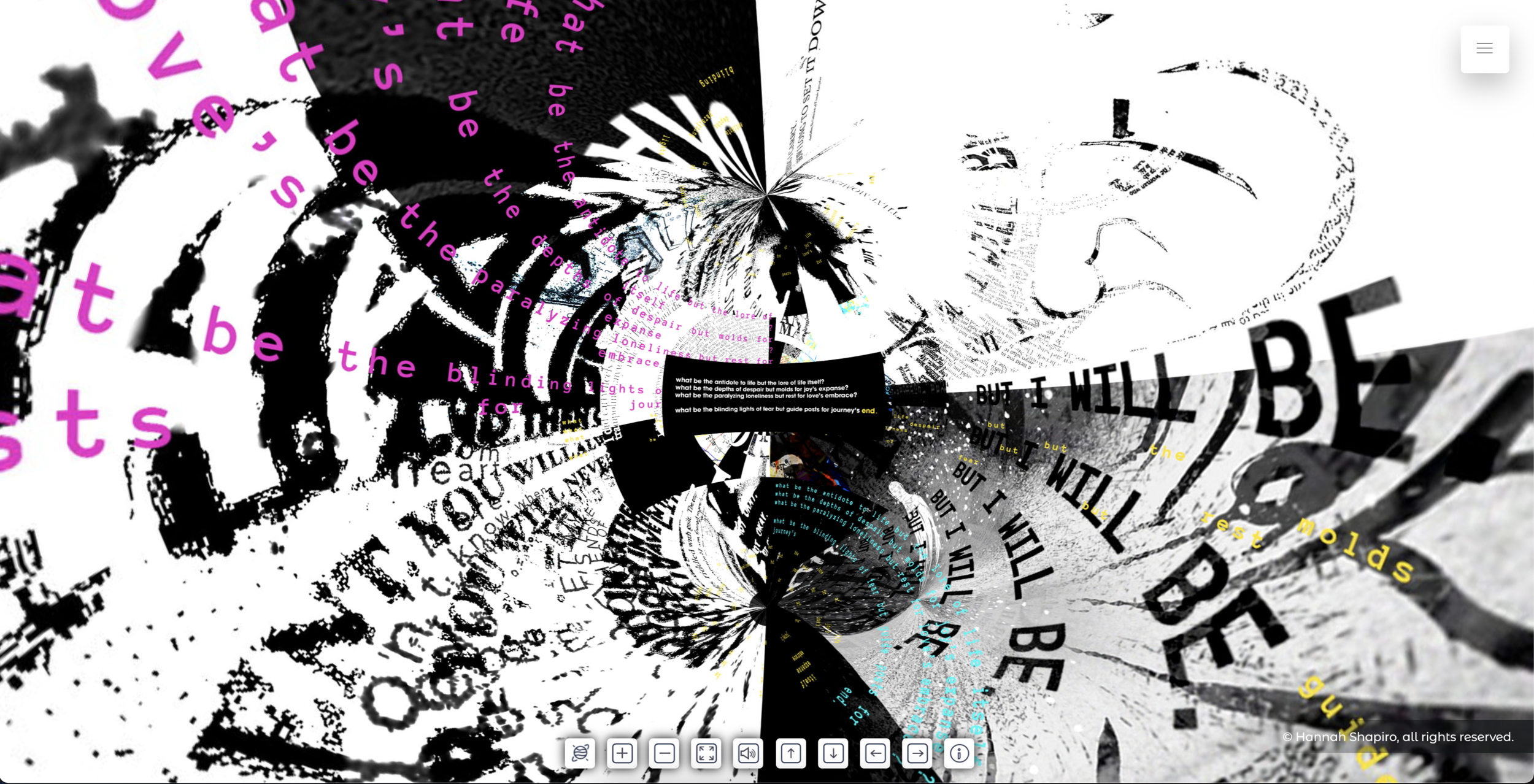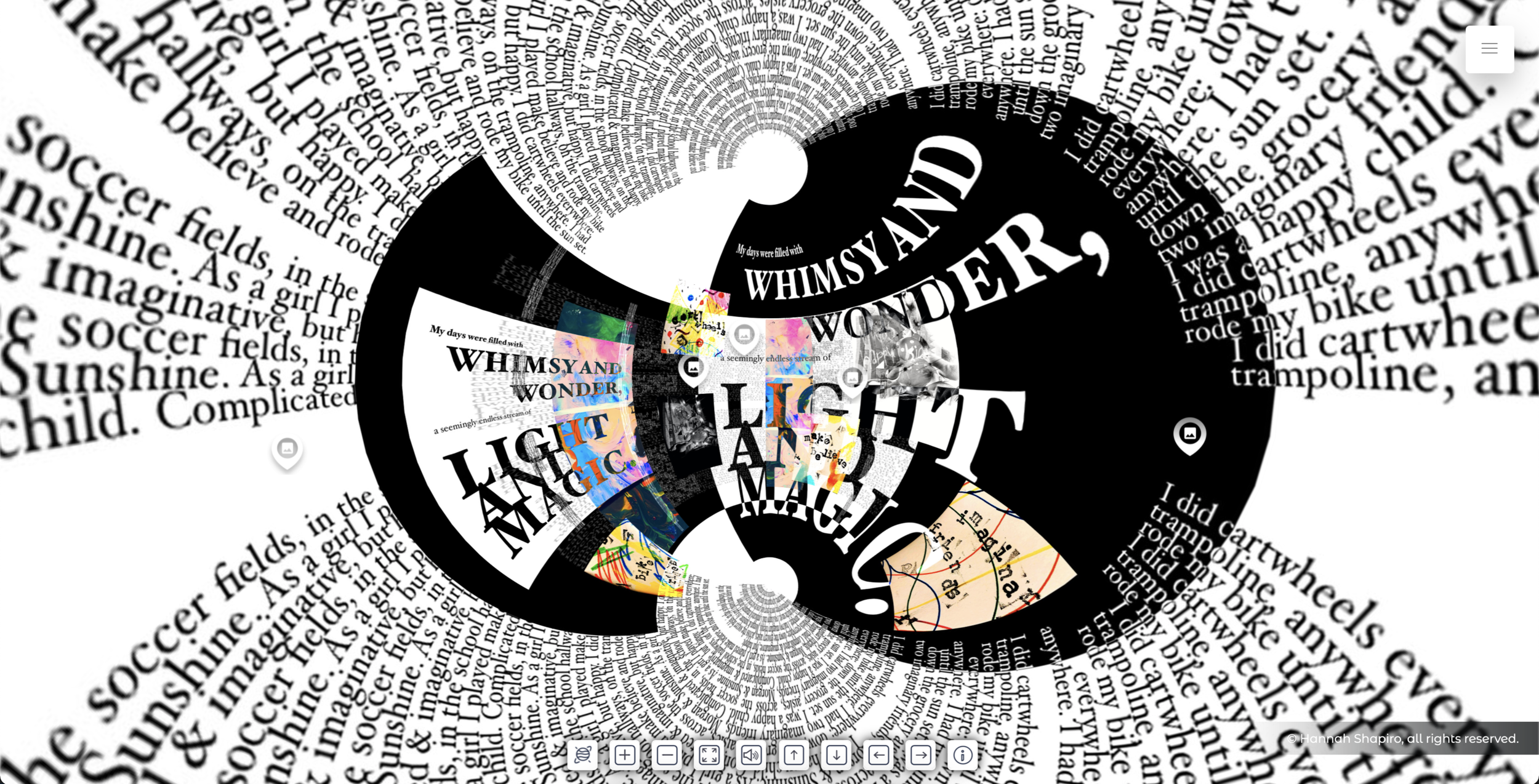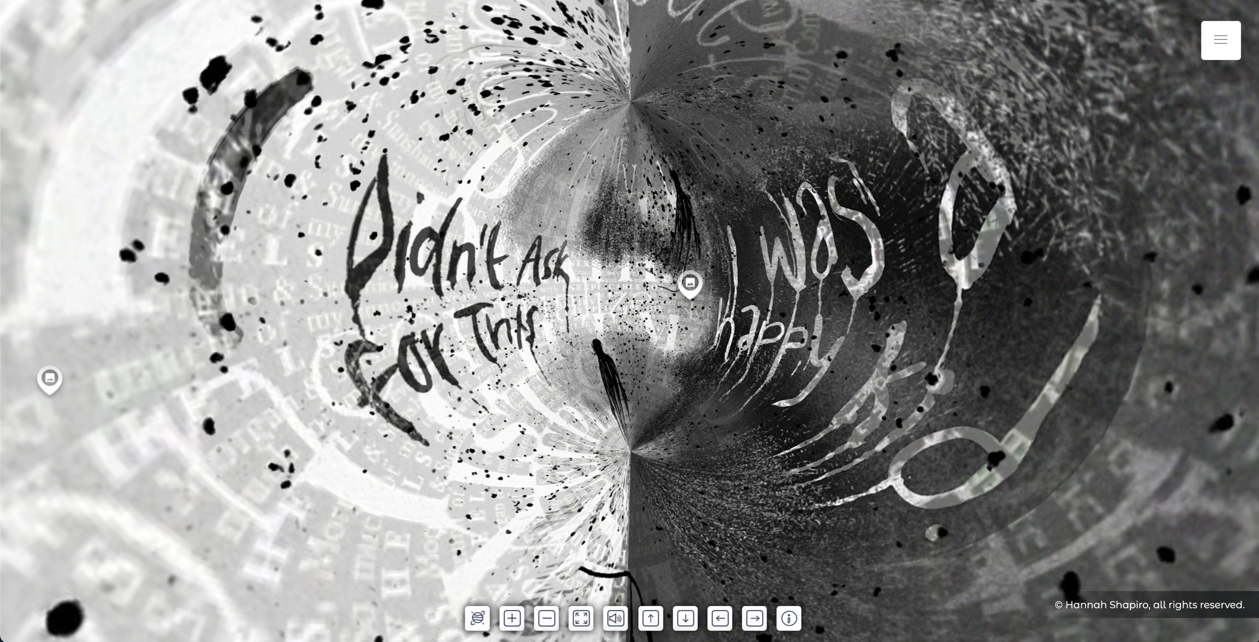The story had unfolded on the page—but it needed a larger space to live. Exploring themes of human existence, identity, and the world through only my perspective felt limiting and unjust. Yet, in the midst of a global pandemic, sharing my work with others became a challenge. This led to the creation of the virtual, 360° panoramic viewer: an interactive experience where users can observe, question, reflect, and draw their own conclusions at their own pace. In doing so, they construct a narrative that resonates with their individual experiences while contributing to a broader understanding of our shared humanity.